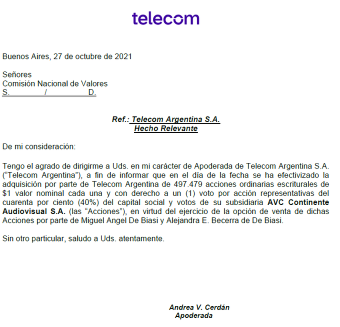 TELECOM ADQUIERE PAQUETE ACCIONARIO DE CABLEOPERADORA DE CORDOBA